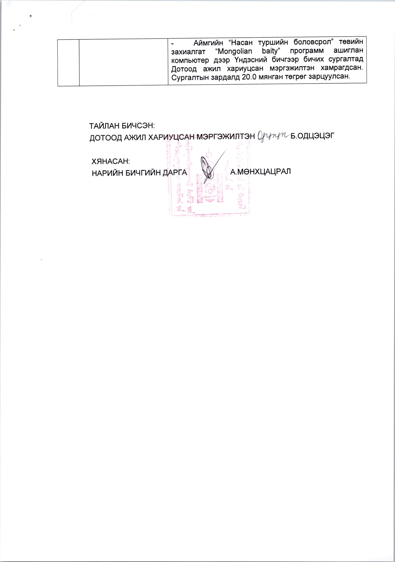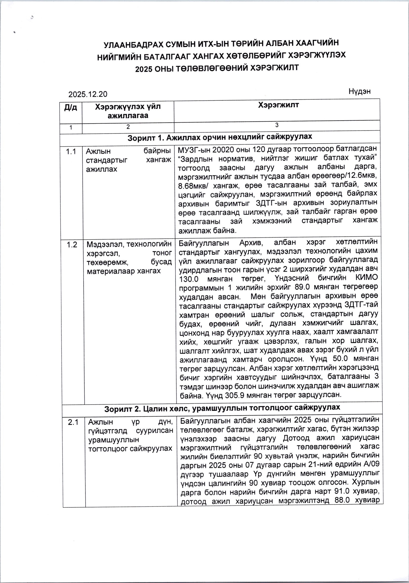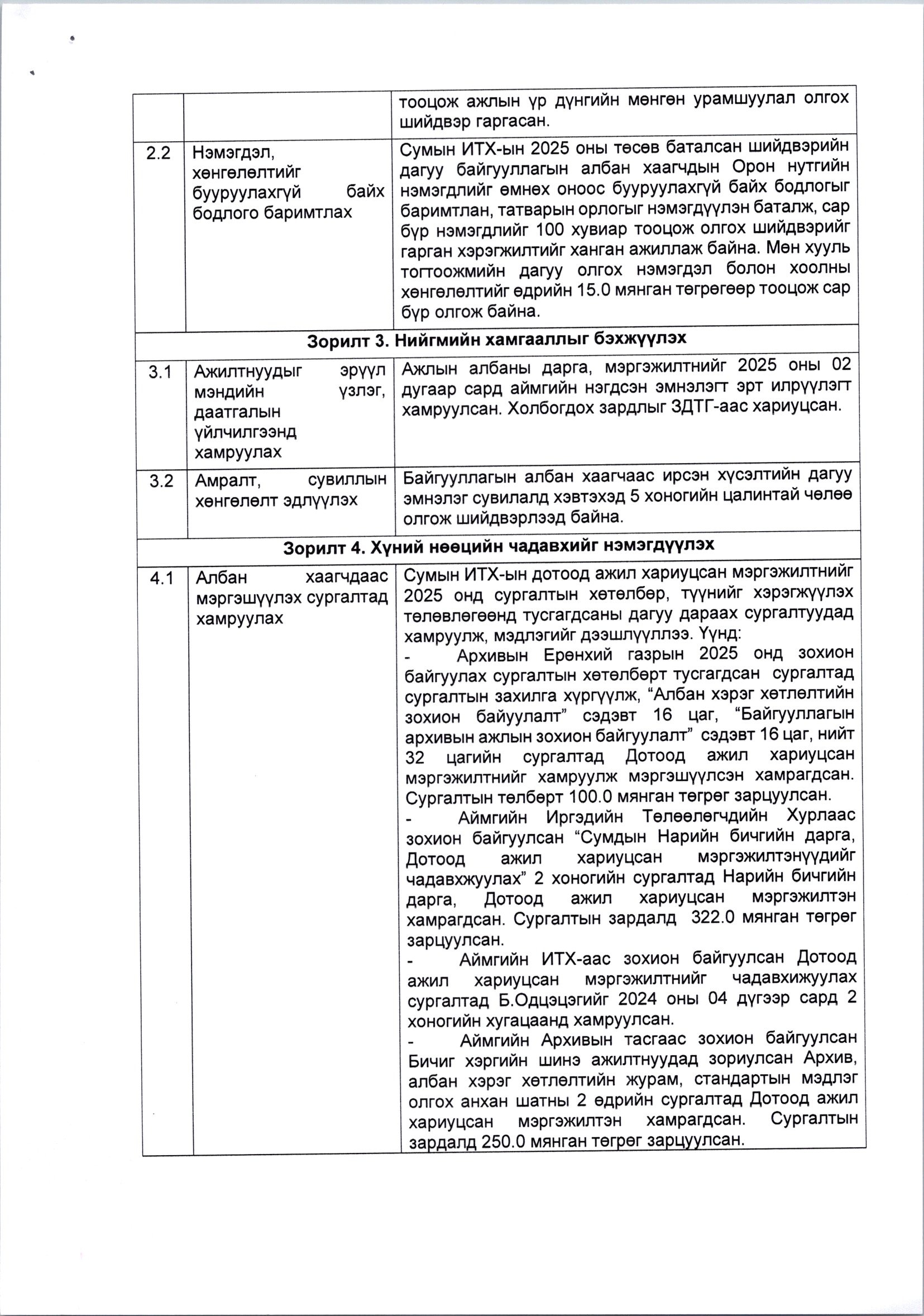 Сумын Иргэдийн Төлөөлөгчдийн Хурлын төрийн албан хаагчийн нийгмийн баталгааг хангах хөтөлбөрийг хэрэгжүүлэх төлөвлөгөөний 2025 оны биелэлт